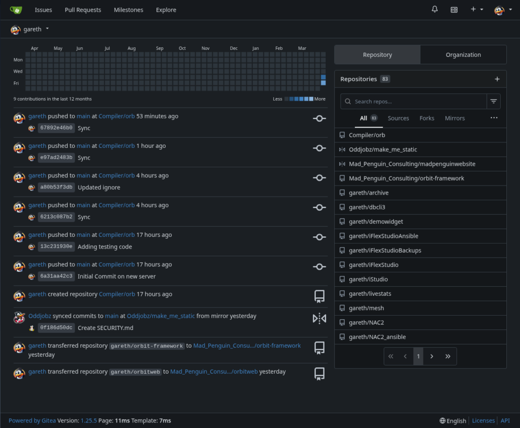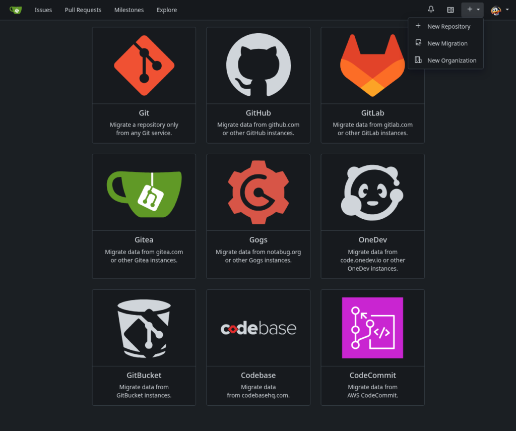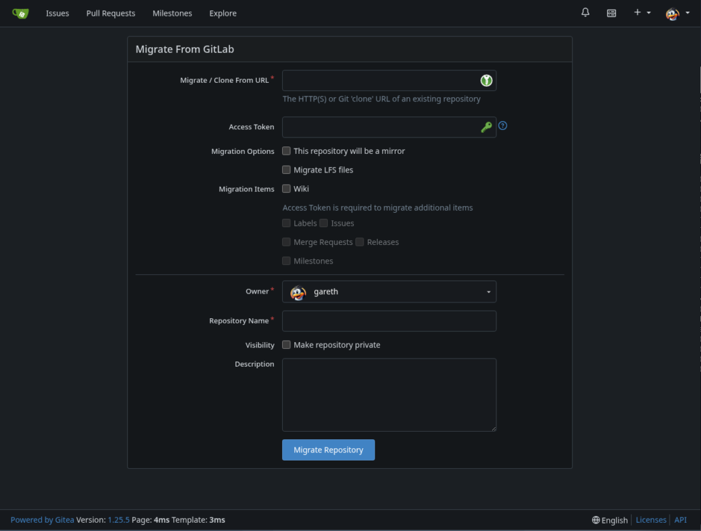 So I had around 100 source code repositories spread over GitHub and GitLab, many of which historically were public. After having made all but one private as a result of the new CRA/PLD legislation, I was faced with not longer needing the liability of having all that code in a public cloud. After wondering idly whether Gitea (which I was experimenting with) had any sort of import facility, I stumbled upon Create -> New Migration …